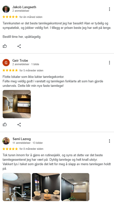 Effekten av tannblekingen kan vare i flere år hvis du tar godt vare på tennene dine. Vi anbefaler at du oppbevarer blekeskinnene, slik at du kan friske opp blekingen senere. Prosessen med tannbleking er helt smertefri.